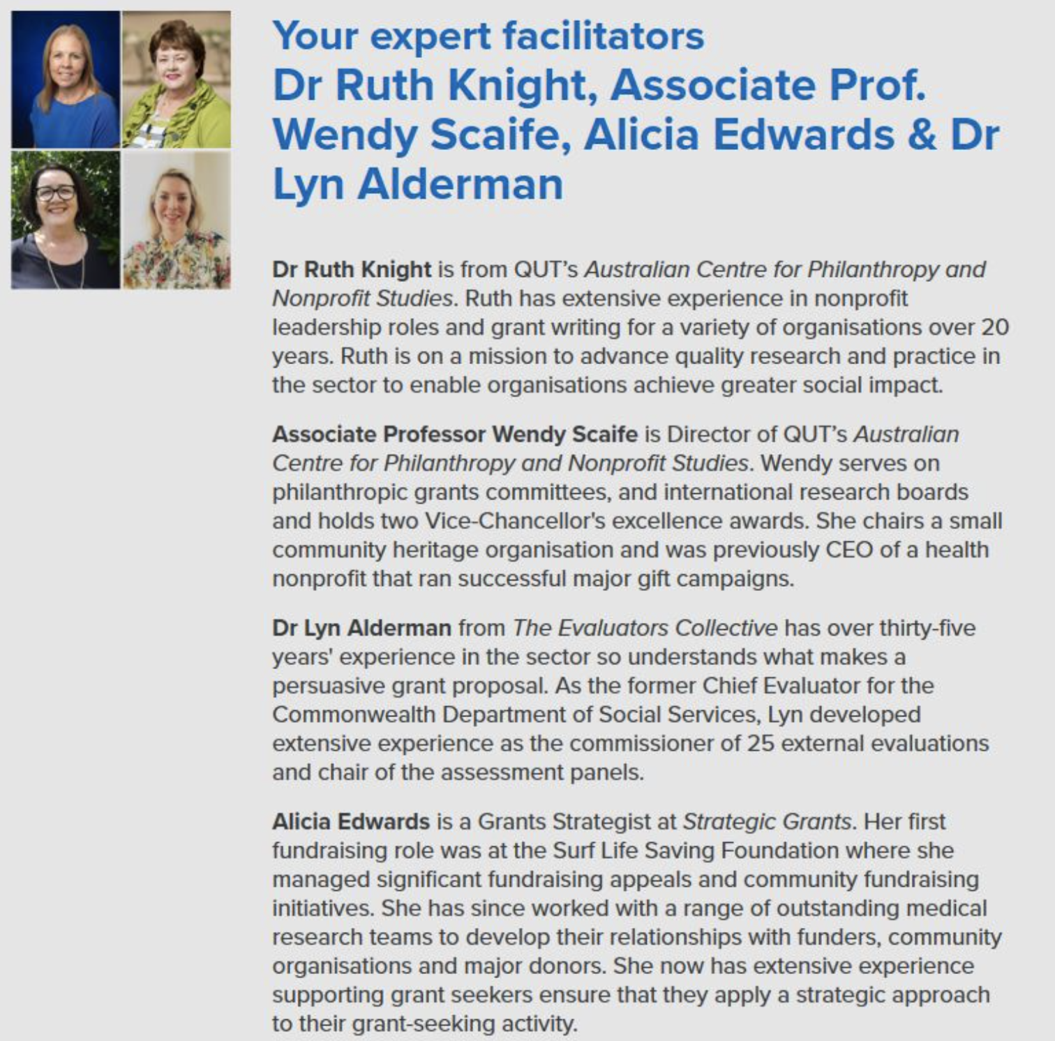 Using a practical discussion-based approach, this workshop, held at QUT in March 2020, covered the importance of planning and research, developing your writing skills, managing risks, and understanding funding guidelines.