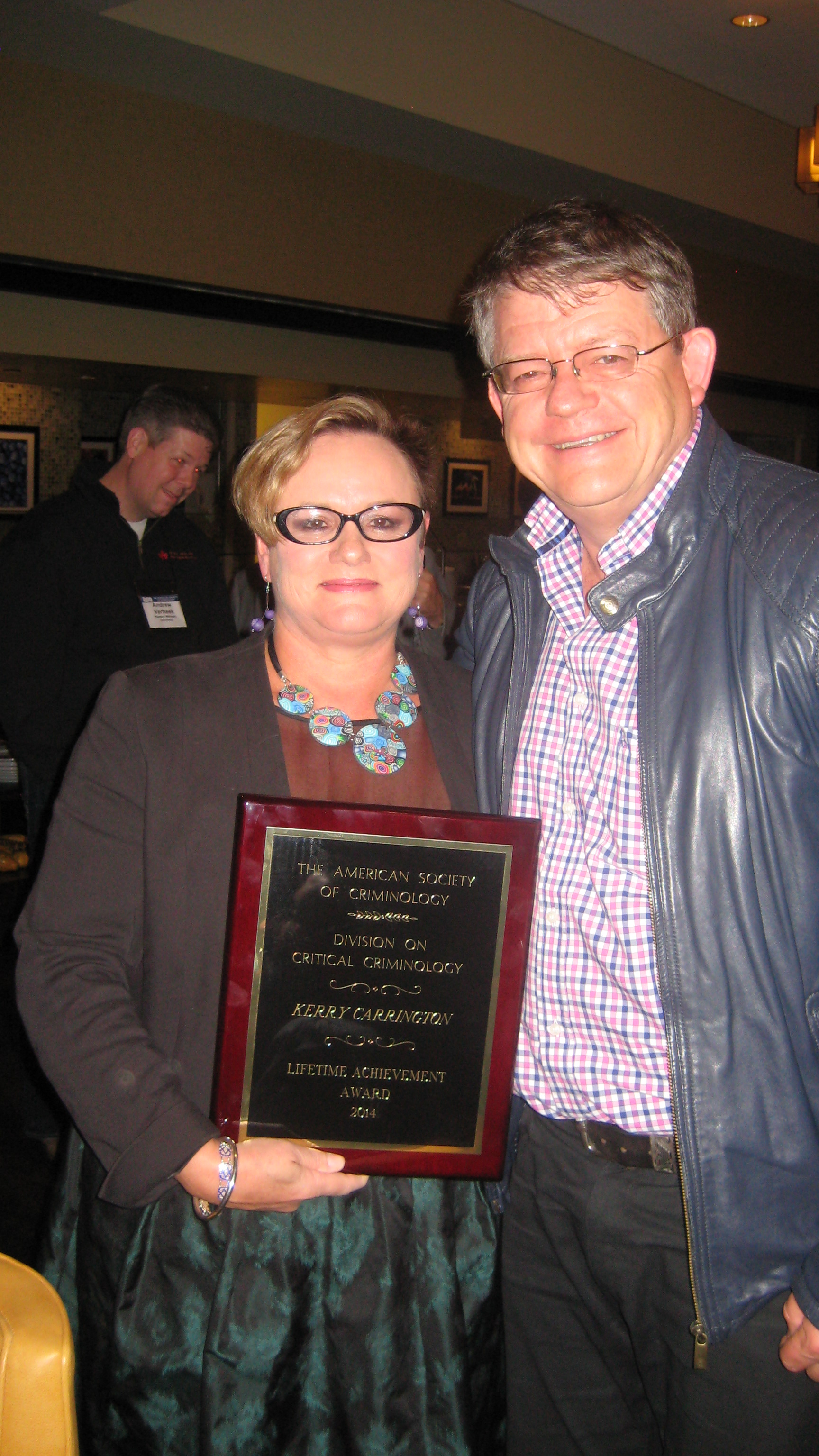 Last year Professor Kerry Carrington was the first from an Australian university to receive a Distinguished Scholar Award, from the American Society of Criminology, Division of Women and Crime http://ascdwc.com/awards/ . This year she has another first ever achievement for an Australian Scholar in criminology