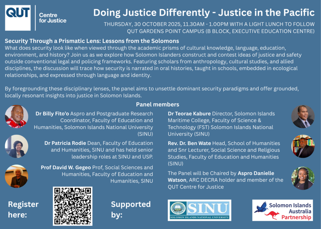 Doing Justice Differently is the annual signature event of QUT Centre for Justice where we share the voices of those working within a particular area. Our audience are policymakers, practitioners, advocates, researchers and educators and our goal is to stimulate discussion and debate around a particular topic.