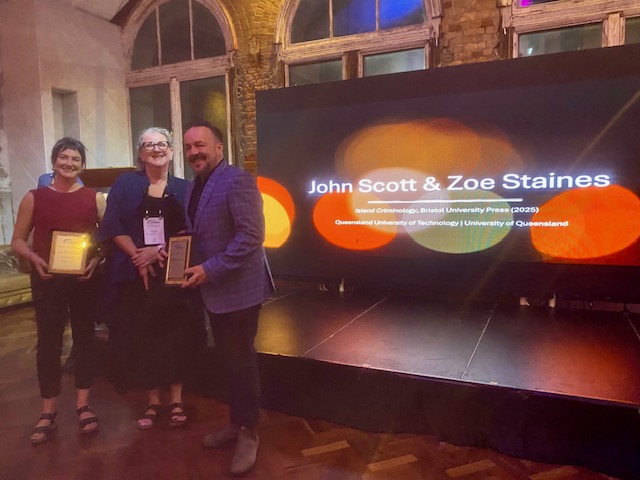 QUT Centre for Justice member Professor John Scott and co-author Dr Zoe Staines were recognised with the Australasian criminology’s top book award in December, for their work Island Criminology (Bristol University Press, 2024).