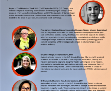 As part of Queensland Disability Action Week from 13-18 September, QUT Design Lab’s Marissa Lindquist is moderating a conversation about designing for change. QUT C4J member, and Senior Lecturer in Creative Industries, Dr Janice Rieger, is involved in his conversation. Details below – Details: Location: https://qut.zoom.us/j/96409099439 Start Date:…
