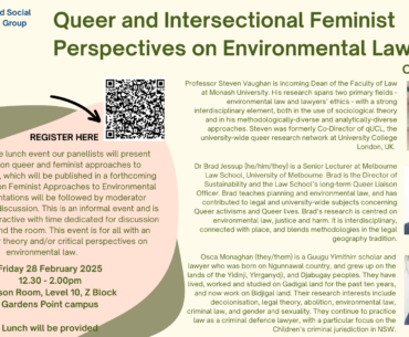 Please join us at a roundtable discussion on Queer and Intersectional Feminist Perspectives on Enviornmental Law Roundtable. At this roundtable lunch event our panellists will present their research on queer and feminist approaches to environmental law, which will be published in a forthcoming edited collection on Feminist Approaches…