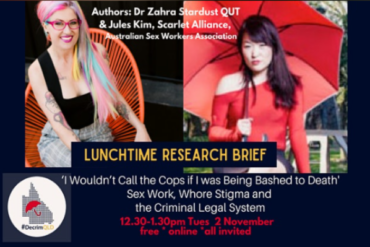 Join us for this free lunchtime research brief with Dr Zahra Stardust, QUT & Jules Kim Scarlet Alliance. About this event #DecrimQLD has the pleasure of presenting a…